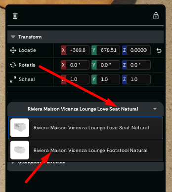 Klik op een object om het te selecteren en naar je scène te slepen. Sommige objecten bevatten meerdere uitvoeringen (varianten). -