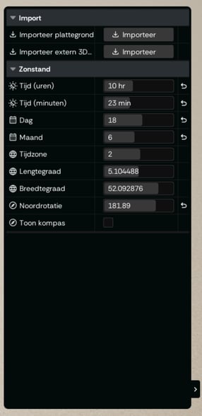 Het rechter zijmenu bevat de importmogelijkheden en de zonstand. Zodra je een object selecteert, zal dit menu alle eigenschappen en opties van het object weergeven.
