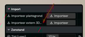 - Import: De bovenste knop laat je een plattegrond importeren en de onderste knop laat je een extern 3D model importeren.