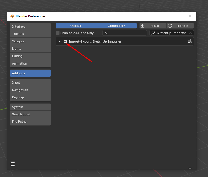 - Zoek het 'sketchup_importer.zip' bestand op en klik op 'Install Add-on'