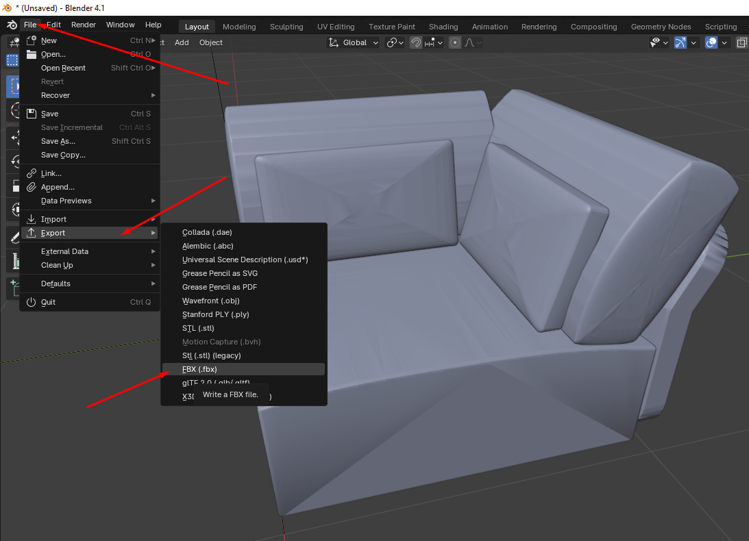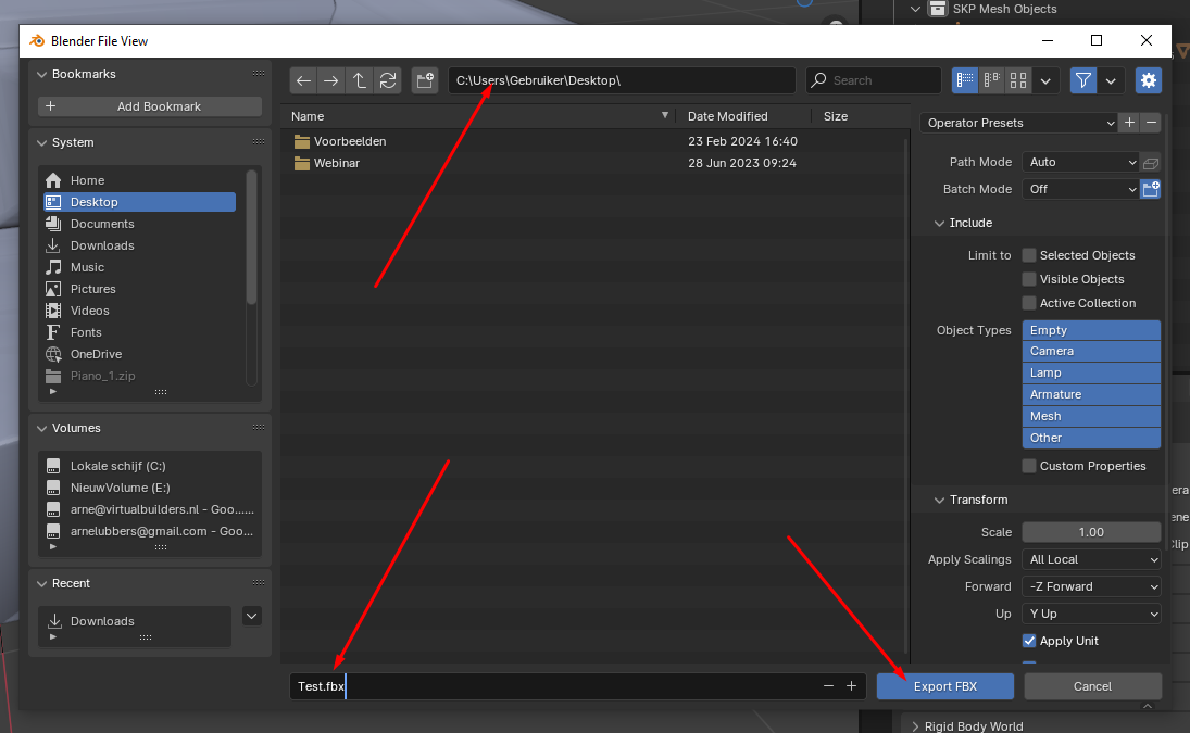 - Kies een map, verander de naam eventueel (deel voor de .fbx) en druk op 'Export FBX'