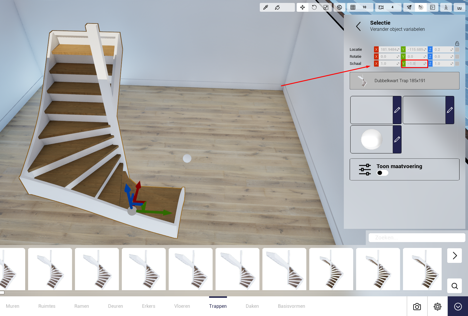 22 april 2025 Kan ik een trap of ander object spiegelen? Om een object te spiegelen, kan je de volgende handeling toepassen; Selecteer het object Open het instellingen menu (tandwiel icoon) Vul bij de schaal van de X- of de Y-as een waarde in van -1
