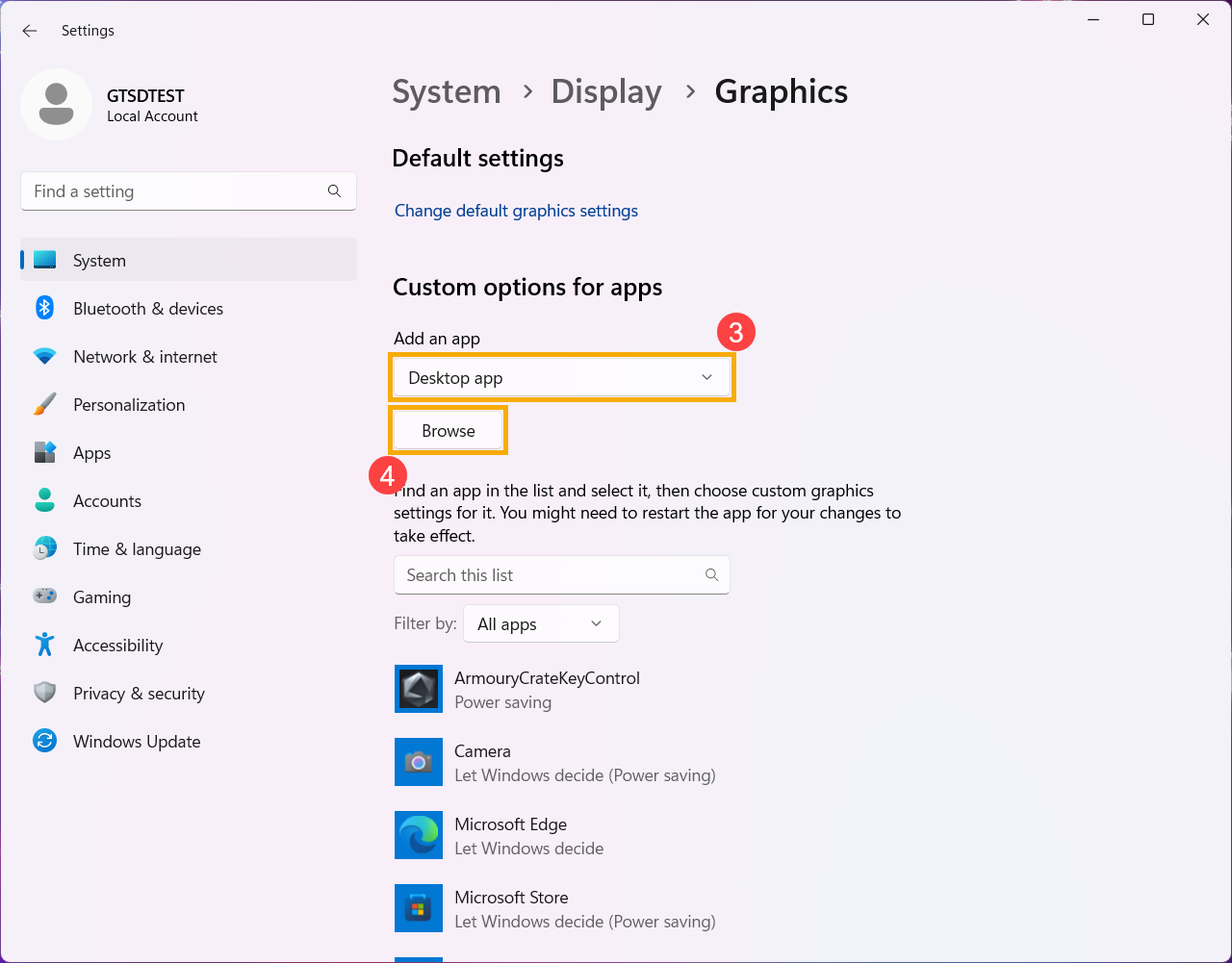 2. In de Aangepaste opties voor apps-instellingen kunt u de applicatie (In dit geval: Unlit) selecteren die u wilt configureren in het vervolgkeuzemenu voor Desktop-app of Microsoft Store-app ③.