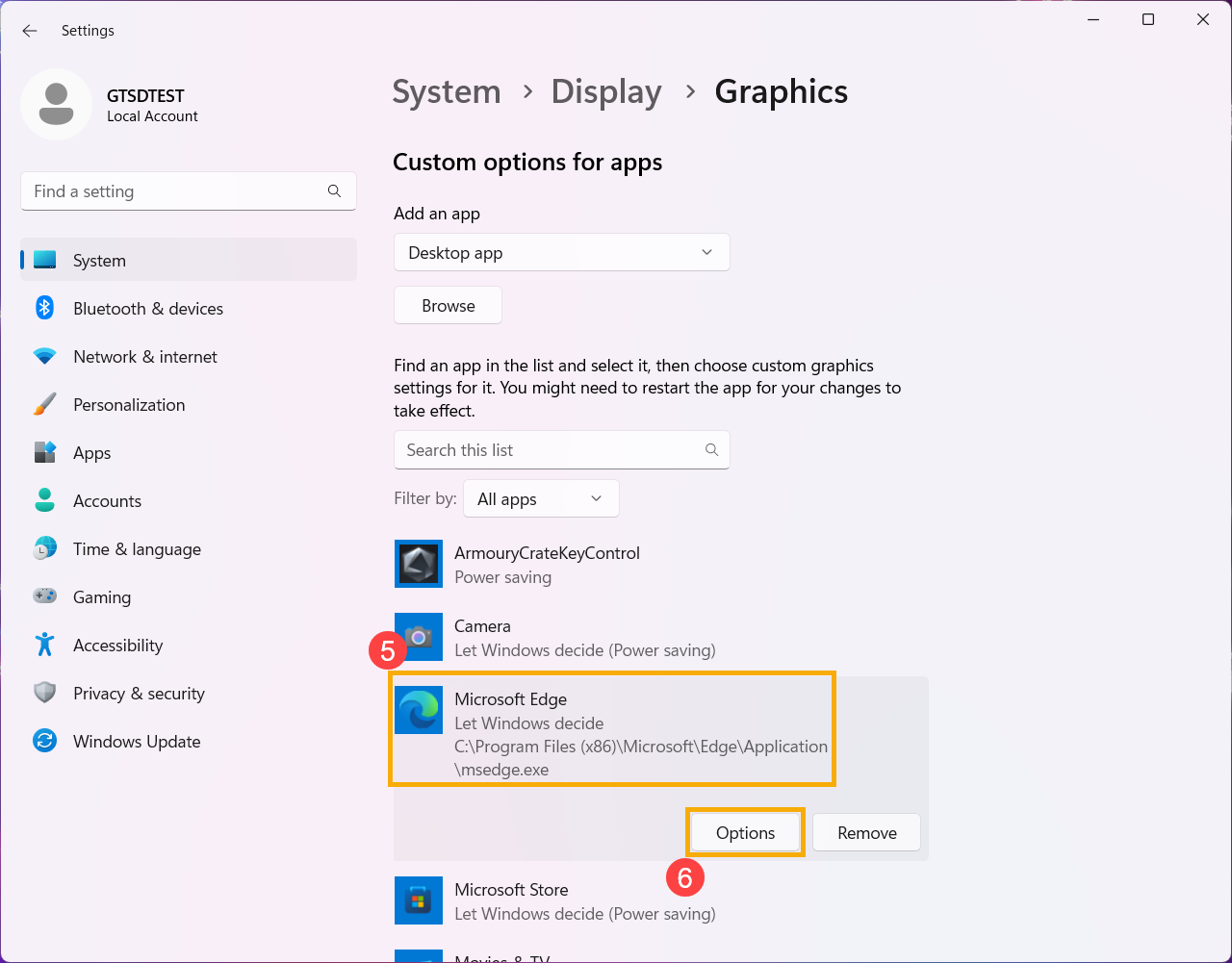 5. Kies de grafische processor die u wilt gebruiken voor de geselecteerde toepassing ⑦ en klik vervolgens op [Opslaan] ⑧.