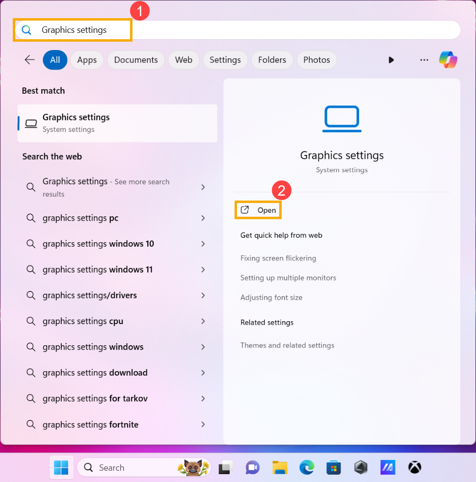 1. Typ en zoek [Grafische instellingen] in de Windows-zoekbalk ① en klik vervolgens op [ Openen] ②.